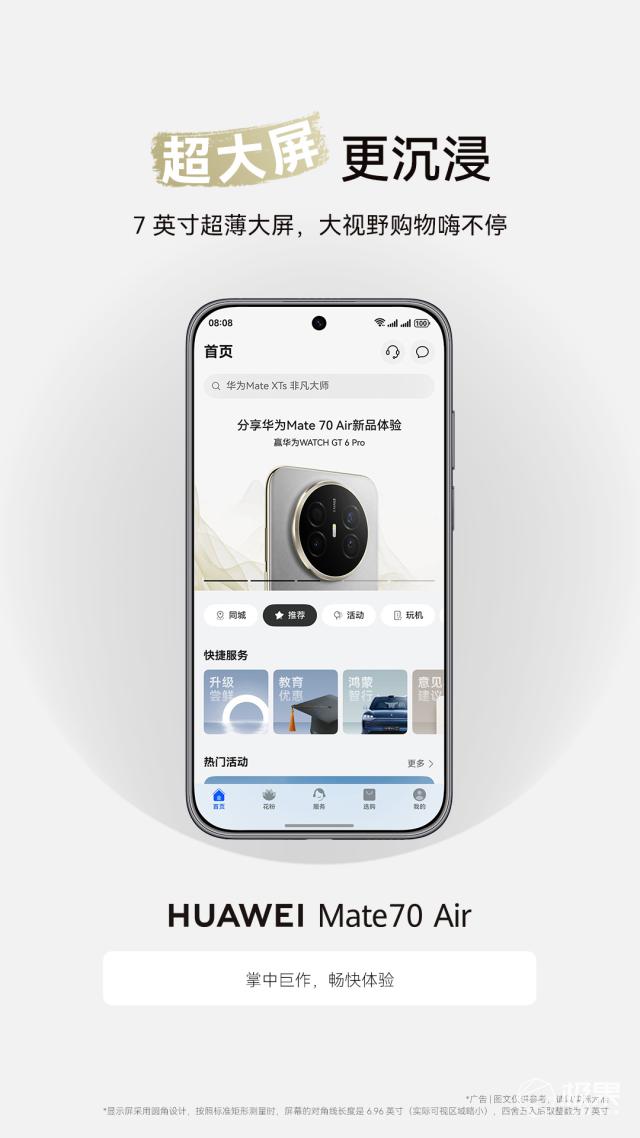 一直以来,高端市场始终缺乏一款真正兼顾轻薄手感、均衡体验与突出亮点的产品双悦网,以满足用户从“够用”到“极致”的体验升级需求。华为 Mate 70 Air 恰好填补了这一空白——它延续了 Mate 系列一贯的硬核风格,同时凭借 7 英寸超大屏与 18.8:9 独特比例,带来开阔而沉浸的视觉体验。搭配仅 6.6mm 的纤薄机身,真正实现了轻薄手感与大屏视野的兼得,更贴合当下年轻人对数字内容的浏览习惯,让大屏体验自然融入日常。