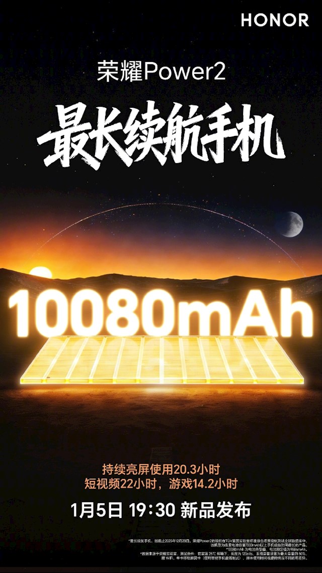 荣耀表示,该机可持续亮屏使用20.3小时,刷22小时短视频,或玩游戏14.2小时。